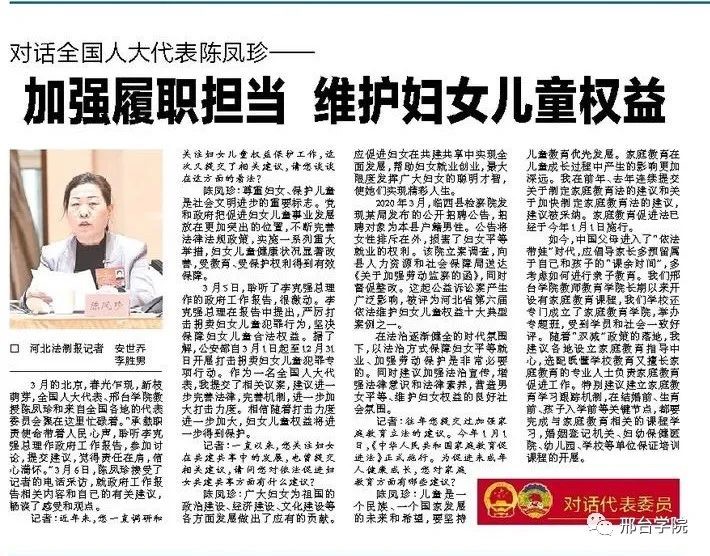 传达全国两会声音,落实全国两会精神。从北京回来的全国人大代表陈凤珍回到学校第一时间把同事们召集起来学习传达全国两会精神,扎实推动宣传贯彻会议精神走深走实。她讲到:全国两会政府工作报告中提出的教育发展、教育提升等方面的内容,目的是想把两会的精神传达到最基层。今年政府工作报告中提出“推进高等教育内涵式发展,分类建设一流大学和一流学科”,针对这项内容,她带领师生深入开展科研工作,将教学与学术研究紧密结合,推动该校教育内涵式发展,高质量发展。