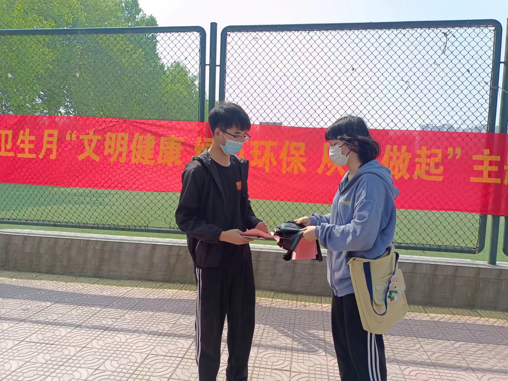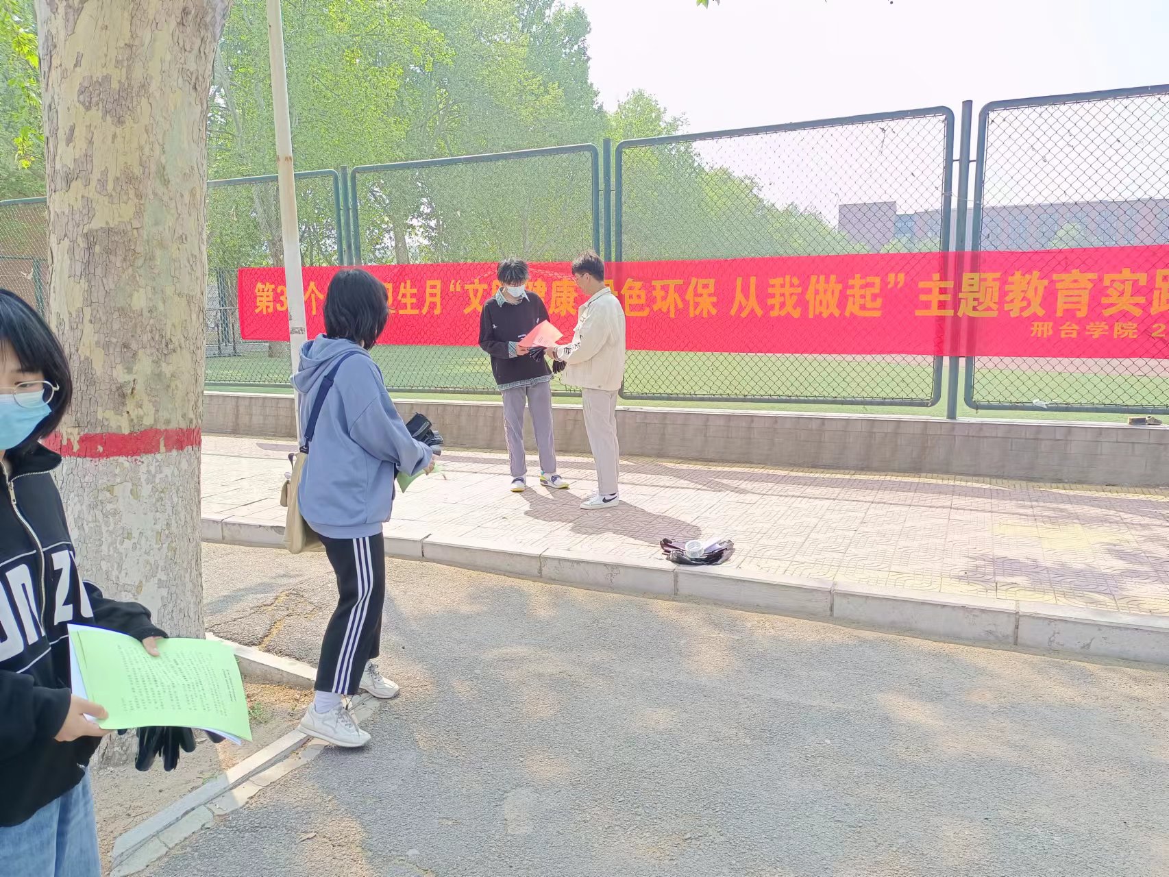 4月11日,在学府社区永康城市花园小区,教师志愿者向居民分发了“文明健康 绿色环保 从我做起”宣传页、“邢台市创建文明城市明白纸”和垃圾袋等宣传品,宣传疫情防控、垃圾分类、健康生活等知识,倡导大家坚持文明健康绿色环保生活方式。宣传活动后,志愿者在小区绿从等卫生死角,参与了小区的环境卫生整治工作。4月18日,大学生志愿者在校园里向同学们发放了“文明健康 绿色环保”倡议书,号召同学们从自己做起,从小处做起,坚持绿色环保理念,培育健康生活方式。