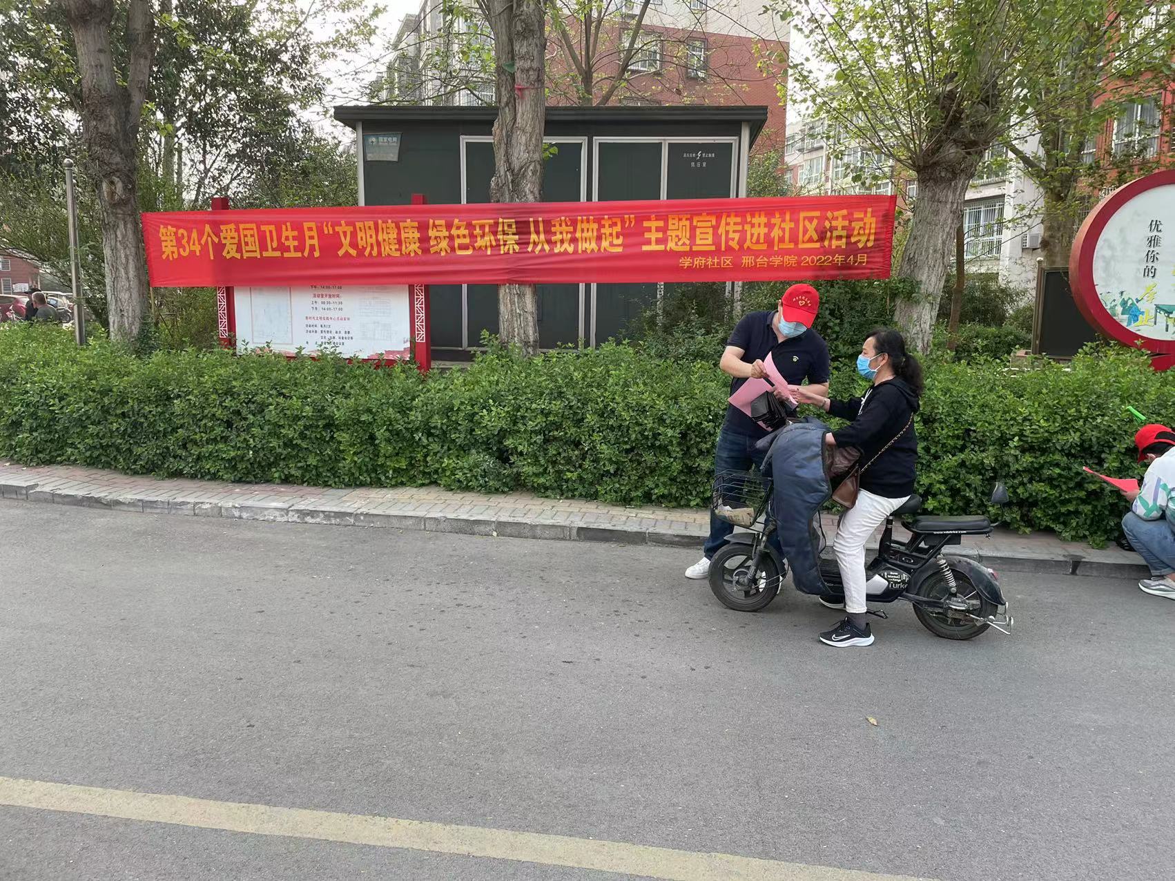 2022年4月是全国第34个爱国卫生月。为深入开展爱国卫生运动,提升居民和师生的自我卫生意识和健康素养水平,推动形成文明健康、绿色环保生活方式,筑牢常态化疫情防控的社会防线,邢台学院志愿者开展了“文明健康绿色环保 从我做起”主题宣传实践活动。