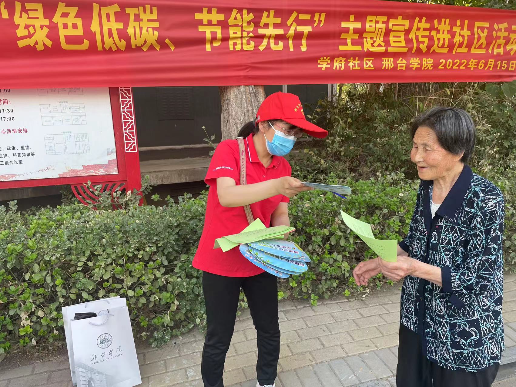 6月13日至19日是全国节能宣传周,活动主题是“绿色低碳、节能先行”。6月15日是2022年“全国低碳日”,主题是“落实‘双碳’行动,共建美丽家园”。当天下午,邢台学院志愿服务小分队到学府社区永康城市花园小区开展“绿色低碳节能先行”主题宣传进社区活动。