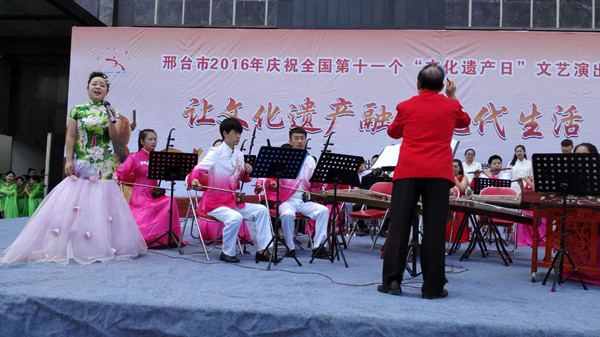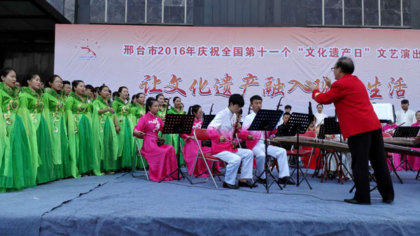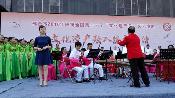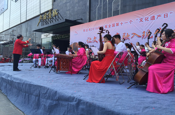 6月11日是我国第十一个文化遗产日,今年主题为“让文化遗产融入现代生活”。作为邢台市庆祝文化遗产日的主会场活动,音乐系师生共计100余人在北国商城门口演出台向全市人民献上了一台精彩的文艺演出,弘扬了民族优秀传统文化,丰富了邢台市民的文化生活。该活动由邢台市文化广电新闻出版局、邢台学院主办,邢台市非物质文化遗产保护中心和邢台学院音乐系协办。